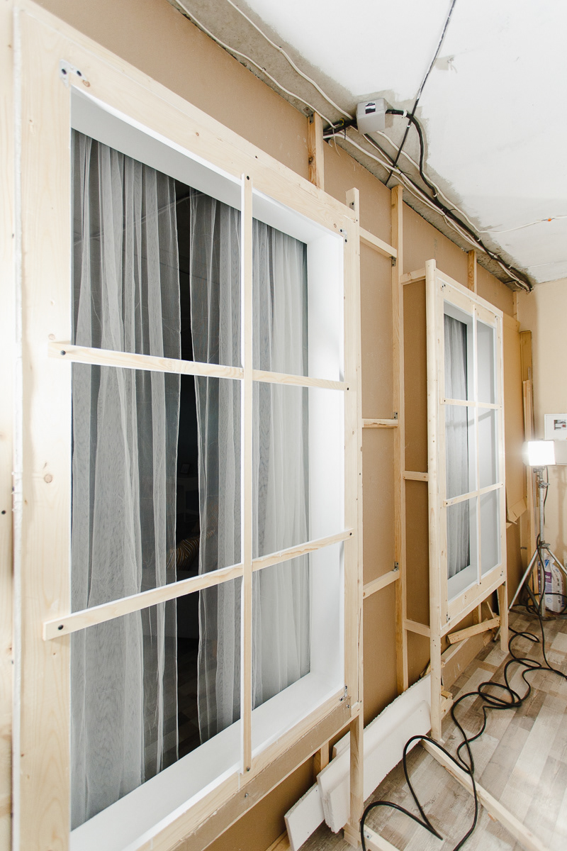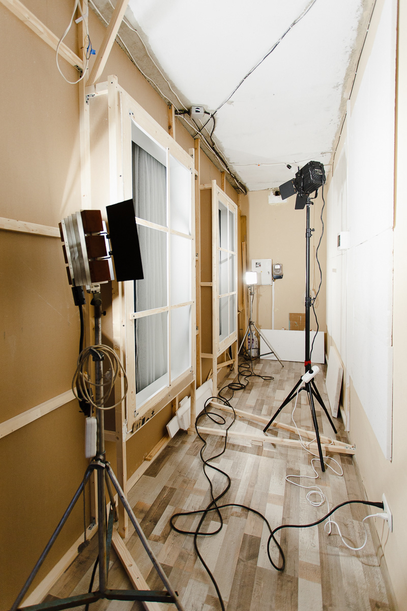 В нашій студії є можливість зімітувати практично будь-яке освітлення, від сонячного ранку до глибокої ночі, оскільки за фальш стіною, на якій розташовані вікна, є достатньо місця для розташування освітлювальних приладів. Також за вікнами можна повісити банер з будь-яким фоном, наприклад вигляд на місто або пейзаж. Просимо звернути увагу на те, що стеля в студії є технічною і не підходить для зйомки.